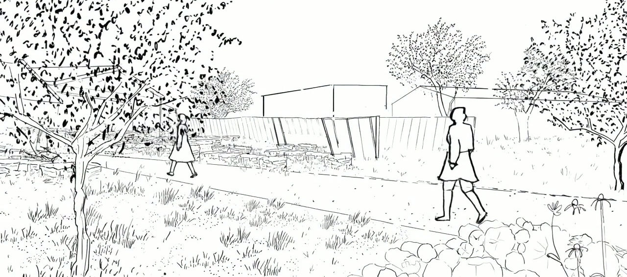 The masterplan reinterprets this landscape structure by organising buildings, circulation routes and outdoor spaces along the ridge, reconnecting the historic farmstead with the wider peatland landscape while maintaining the character of the Levels.